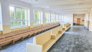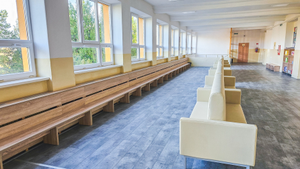 Pohodlné čalúnené sedenie s pevnou a stabilnou kovovou podnožou a robustnou drevenou konštrukciou umiestnené v priestoroch chodby. Výplň molitan a vlnité pružiny. Kvalitná poťahová látka Silvertex.